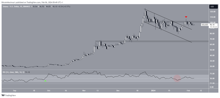 日足のテクニカル分析によると、SOLは2023年12月25日以降、下降する平行チャネルの内側に位置している。この下降は、2024年1月23日に79ドルの安値につながった。