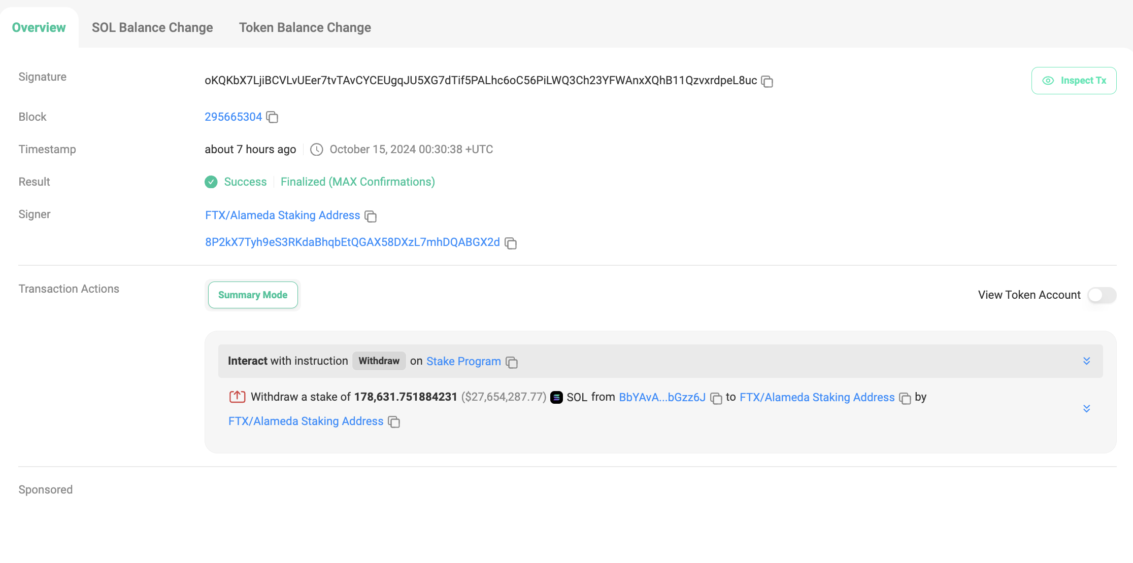 火曜日の早朝、FTX/Alamedaに属するSOLステーキングアドレスは、現在の市場価格で1億2800万ドル以上の価値がある17万8631SOLコインを再び償還した。