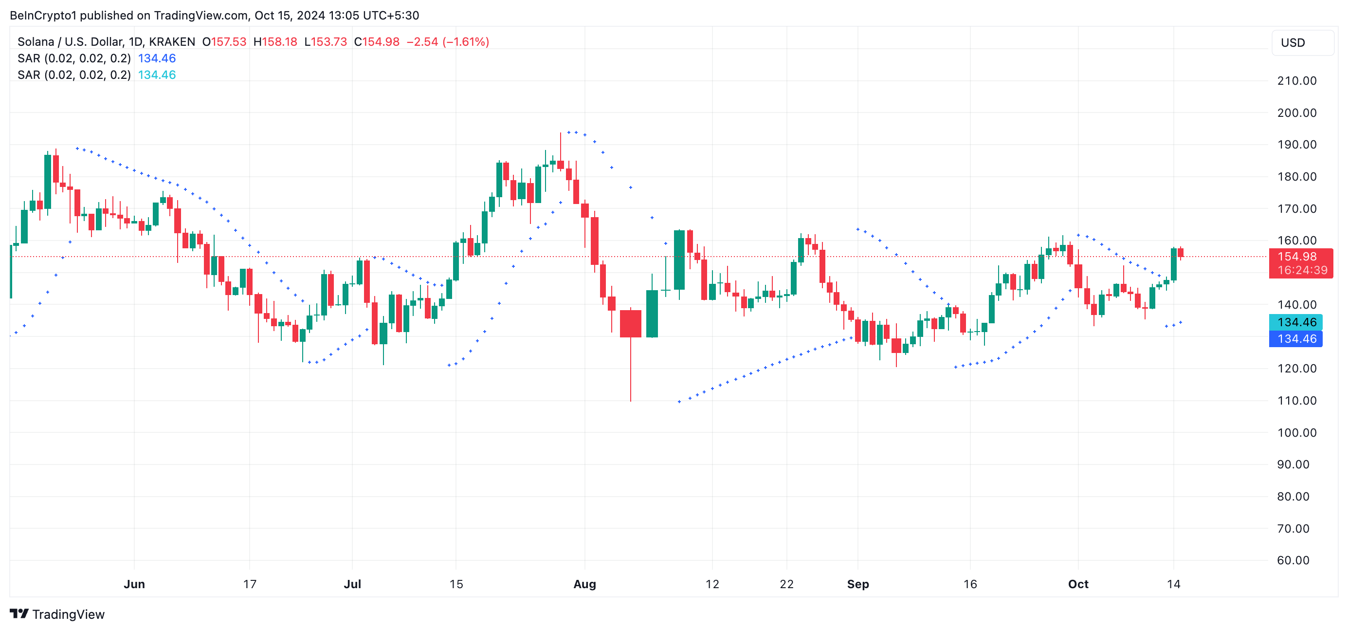 しかし、トレーダーは安心できるかもしれない。現在SOLは一般市場の上昇傾向から恩恵を受けており、この記事の執筆時点での取引価格は154.56ドルで、過去1週間で8%の価格上昇を記録している。その強気の傾向は、パラボリック・ストップ・アンド・リバース(SAR)指標によって示されている。