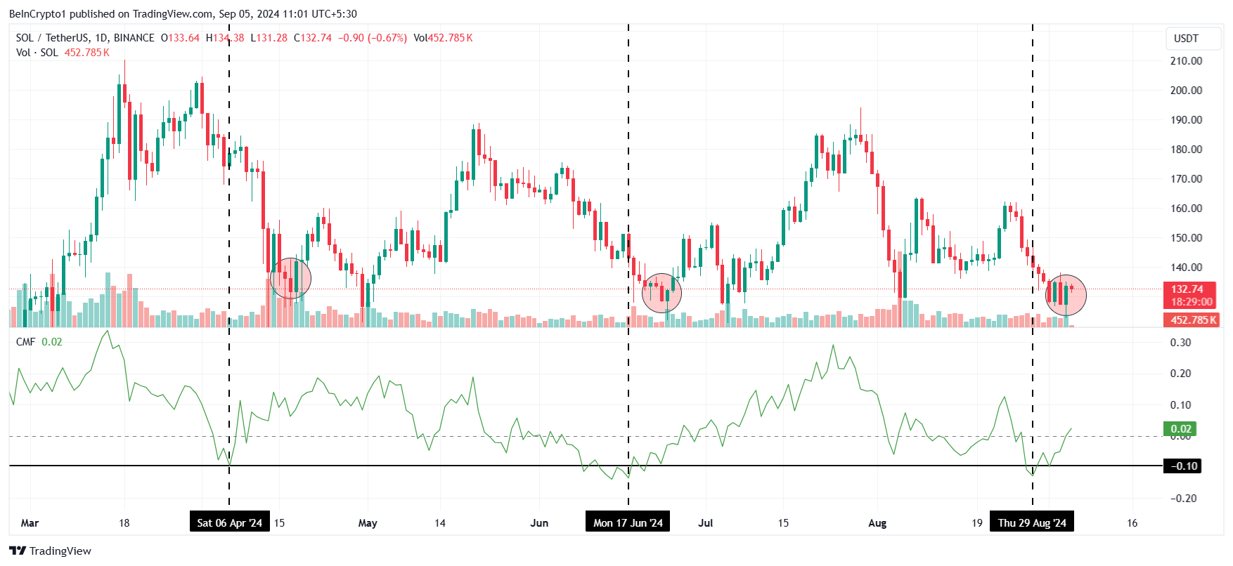 さらに、資産に出入りするお金の累積フローを測定するチャイキンマネーフロー(CMF)指標は、SOLの顕著なパターンを確立しています。歴史的に、CMFが-10.0に下がるたびに、Solanaは7〜10日以内に回復する傾向があります。このパターンは、最近の下落が一時的なものであり、近い将来、流入の増加が価格を押し上げる可能性があることを示唆しています。