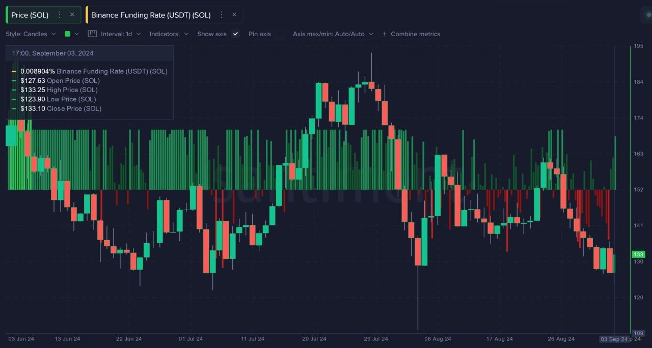 Solanaの潜在的な回復を評価する際の重要な要素は、最近の資金調達率のマイナス転換です。この指標は、先物市場でポジションを保有するコストを追跡するもので、多くの場合、市場センチメントの変化を示しています。
