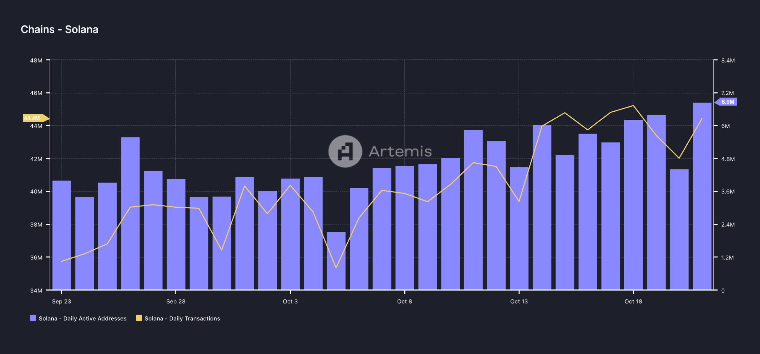 過去30日間で、ソラナネットワークへの需要が急増しました。アルテミスのデータによると、この期間中にソラナで少なくとも1回の取引を完了したユニークアドレスは700万に達し、70%の増加を記録しました。