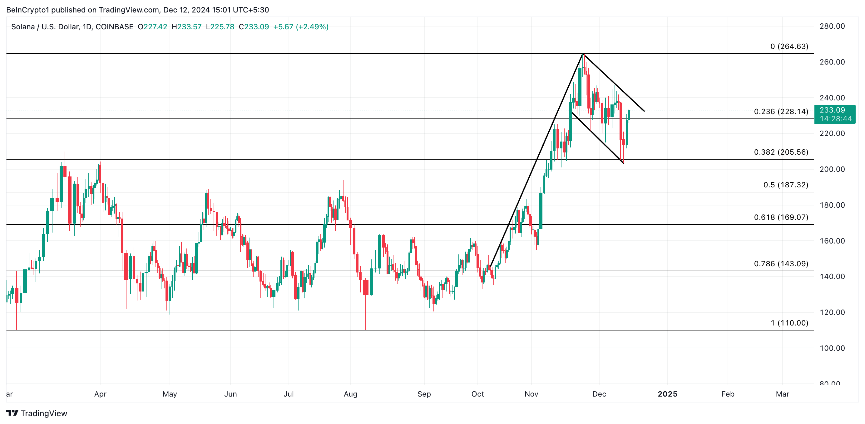 SOLは現在233.09ドルで取引されている、228.14ドルで形成されたサポートのすぐ上に位置している。上昇フラッグパターンの統合範囲の上部ラインを成功裏に突破すると、コインの価格は過去最高値の264.63ドルに向かって進む。