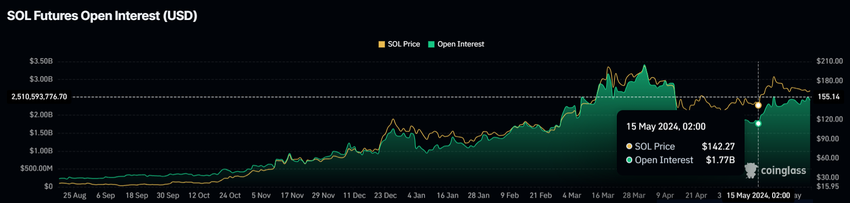 Solanaの価格は、投資家がネットワークを後押しし続けることで、投資家の楽観主義を引き継ぐ可能性がある。彼らの強気の証拠は、SOLのオープンインタレスト(OI)に現れている。建玉残高(OI)は、未決済の先物またはオプション契約の総数を表す。