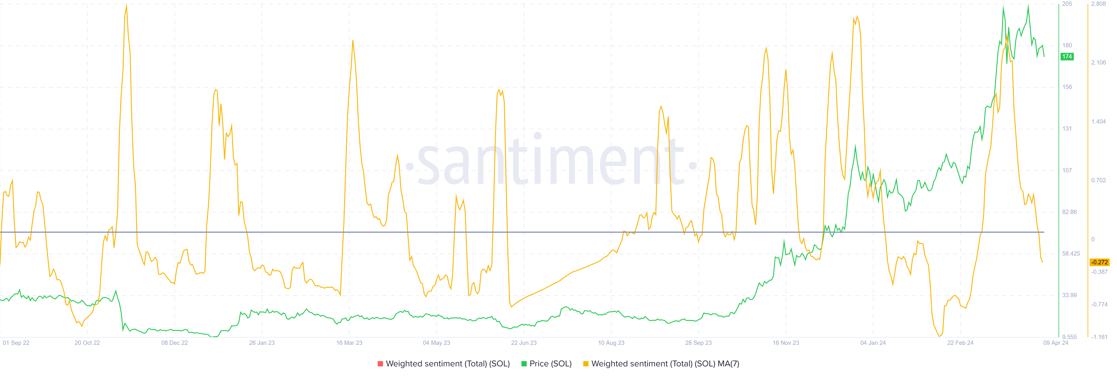 SOLの投資家の間で悲観論が高まっていることは、楽観主義の欠如をさらに実証している。これは、加重センチメントで観察された下降から顕著である。この指標はゼロラインを下回っており、弱気派が投資家を支配していることを示唆している。