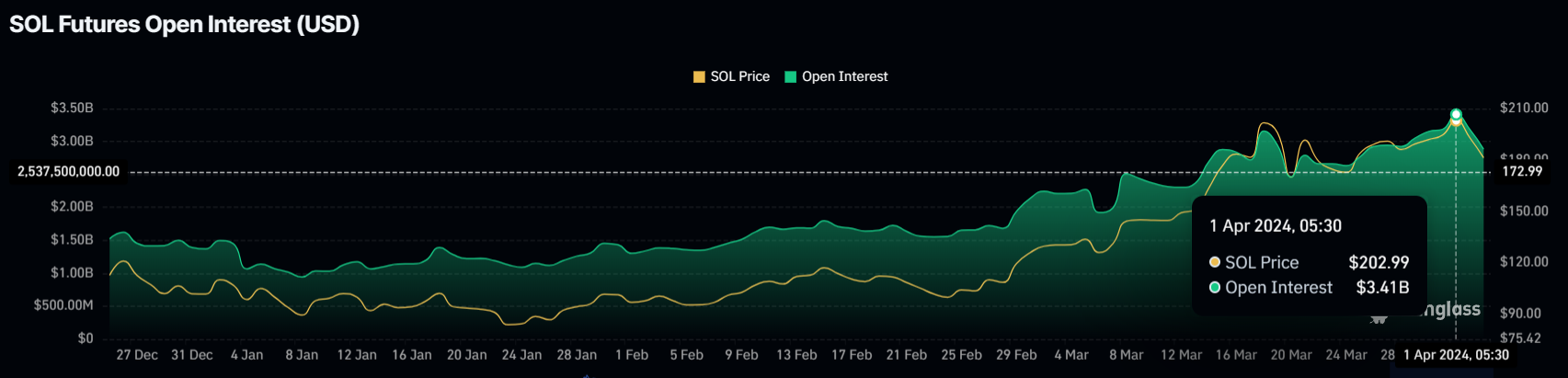 本稿執筆時点では、ソラナの価格は189ドルで、200ドルの抵抗線を突破できていない。この失敗は、オープンインタレスト(OI)の減少に見られるように、投資家の楽観的な見方の減少に反映されている。