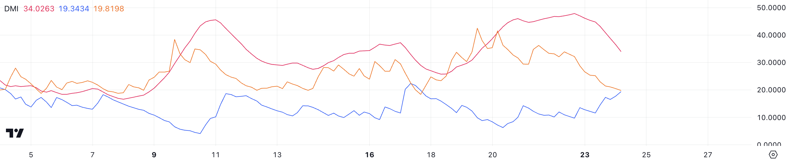 ADXはDMIの主要な構成要素であり、0から100のスケールでトレンドの強さを測定するが、方向性は指定しない。25を超える値は強いトレンドを示し、20未満の値は弱いまたは存在しないトレンドを示唆する。一方、正の方向性指標(D+)は19.34、負の方向性指標(D-)は19.81であり、買い手と売り手の圧力がほぼ均等であるが、わずかに弱気が優勢であることを反映している。