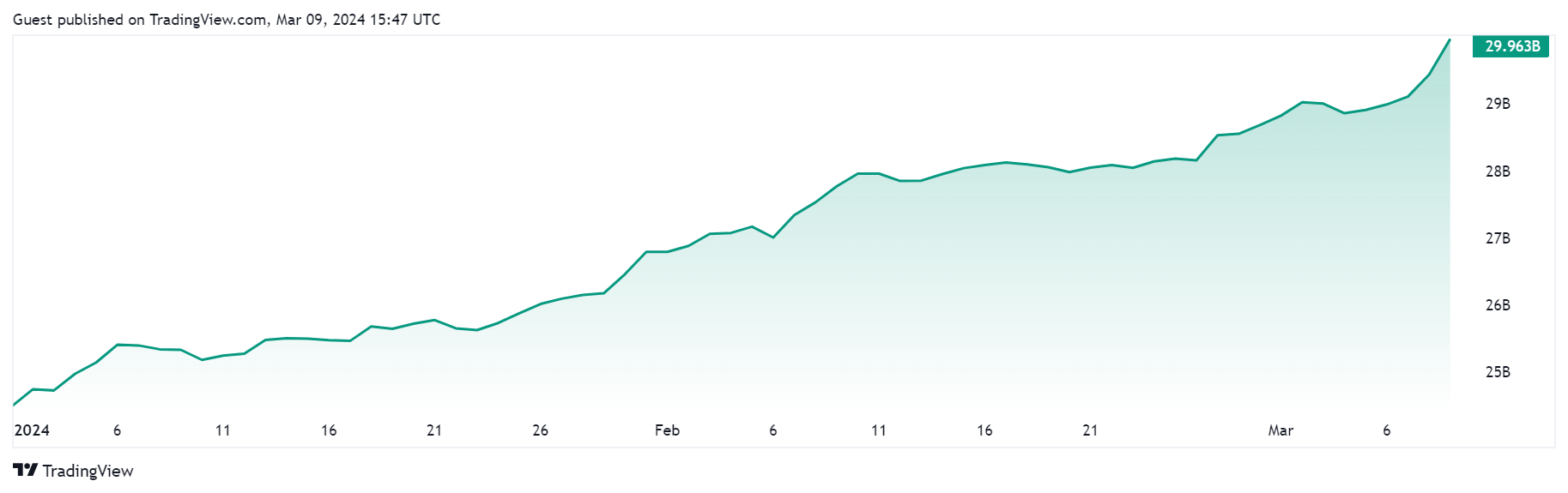 時価総額第2位のステーブルコインであるUSDCは、その供給量が22%急増し、約300億ドルに達した。この増加は、ビットコインとイーサリアムの価格を記録的な高値に押し上げたポジティブな市場心理を示している。