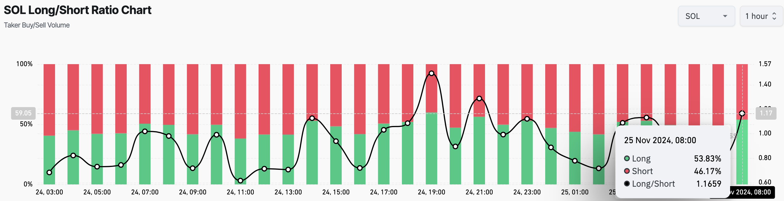 Coinglassのデータによると、ソラナの1時間足でのロング/ショート比率は1.17に上昇している。この比率は市場の期待を測定し、多くのトレーダーが弱気か上昇傾向かを示す。