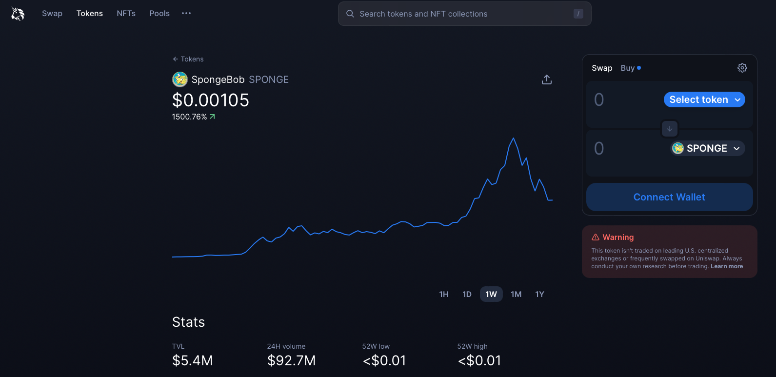 SPONGEはBRC-20規格に基づくミームコインでない。SPONGEはイーサリアムのトークン規格ERC-20に基づいている。同コインのホームページによると、SPONGEはミームコインであり、本質的な価値や金銭的なリターンを期待することはできないとしている。さらに、正式なチームやロードマップもなく、ユーティリティもない娯楽目的のコインと定義している。暗号通貨トラッキングサイトコインマーケットキャップによると、本稿執筆時のSPONGEの時価総額は3800万ドルとなっており、24時間の取引量は9400万ドルを超えている。