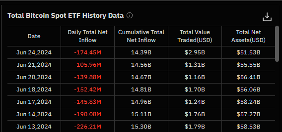 SoSo Valueのデータによると、スポットビットコインETFは6月13日から6月24日まで流出を記録した。Grayscale Bitcoin Trust (GBTC)とFidelity Wise Origin Bitcoin Fund (FBTC)は、6月24日の時点でそれぞれ9000万ドルと3500万ドルの資金流出を記録し、これらの大幅な資金流出の最大の要因となっている。
