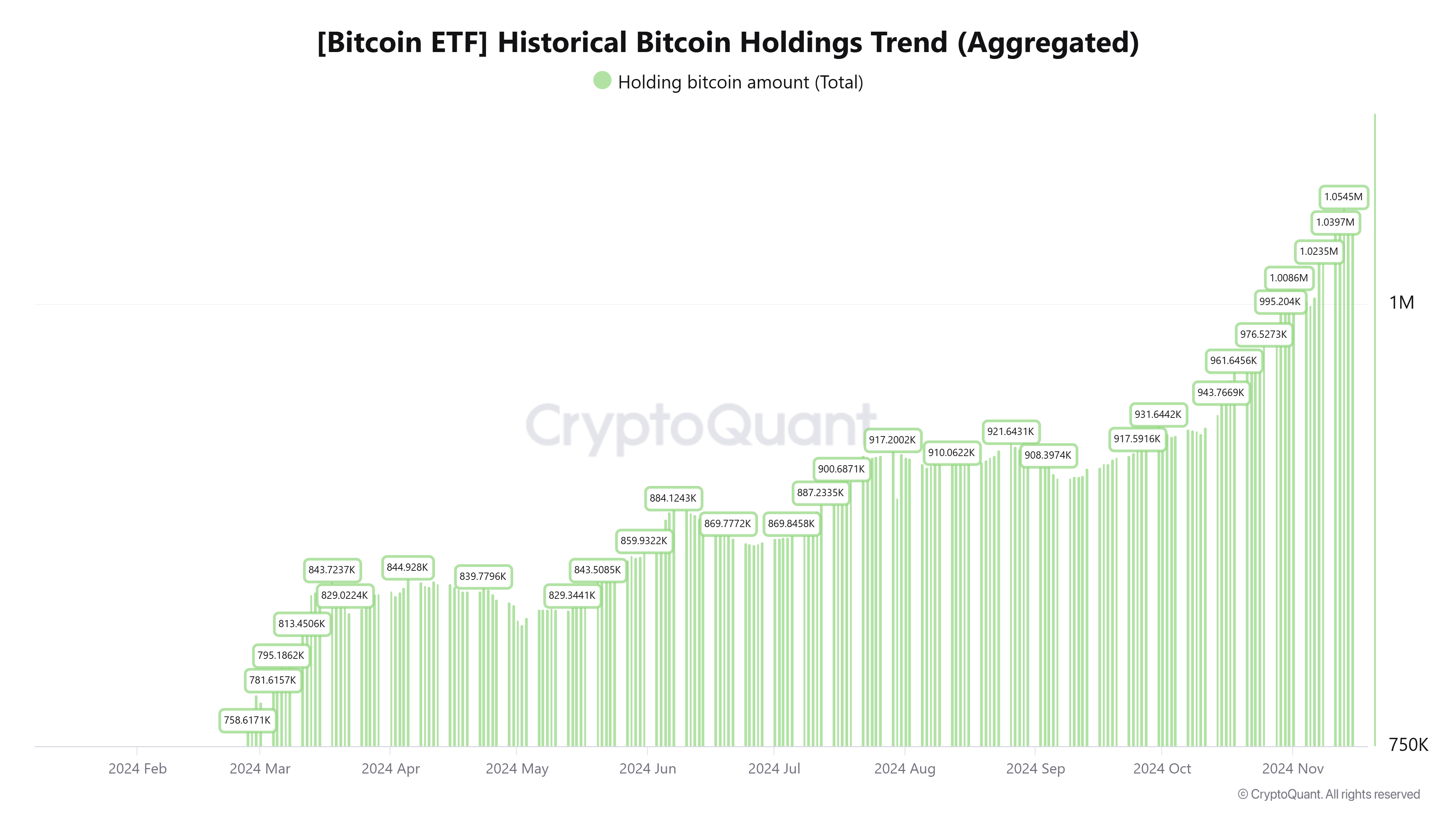 これは10ヶ月で42万5,000BTCが追加されたことを示し、物理的に裏付けられたビットコインETFへの需要が高まっていることを強調している。