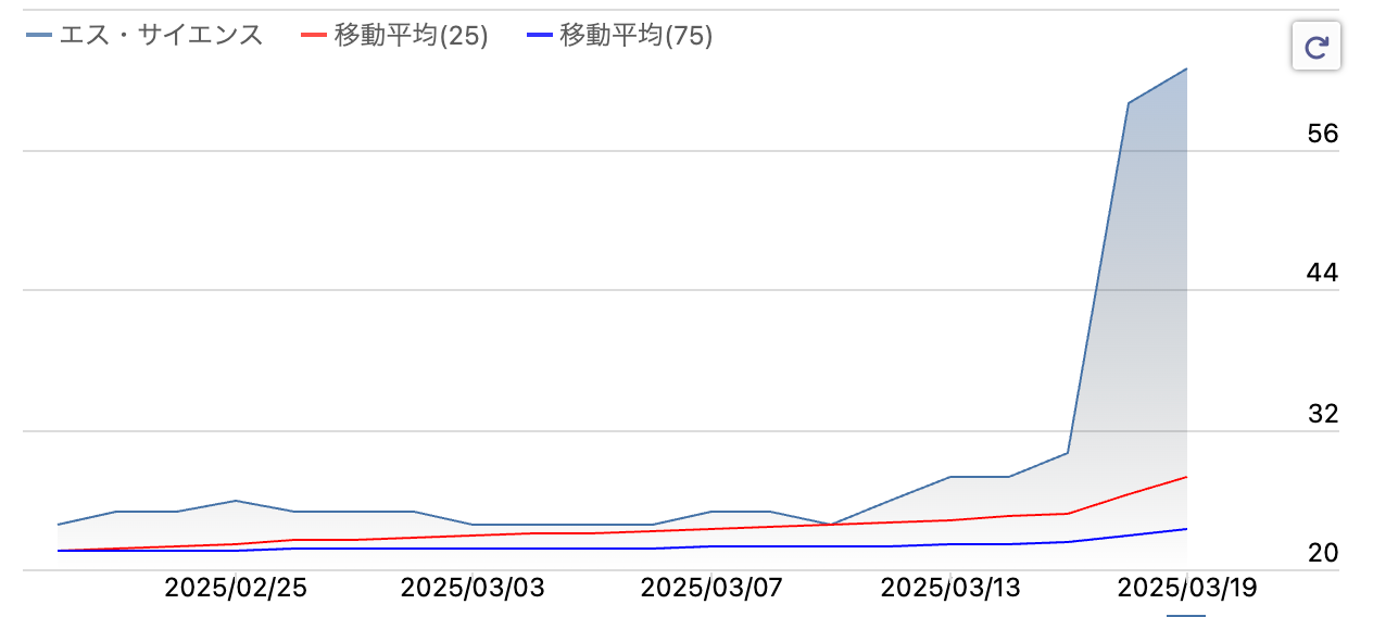エス・サイエンスの株価は18日、前営業日比30円高の60円で買われ、ストップ高となった。19日現在、63.0円となっている。