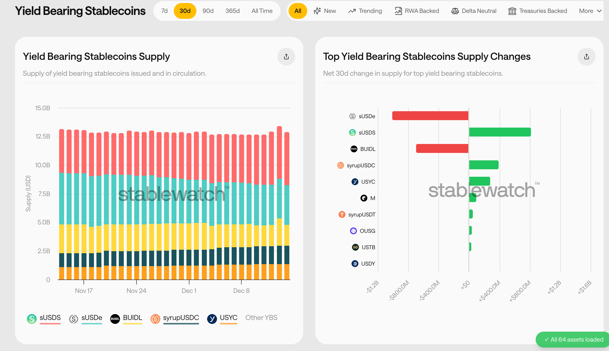 一方、保有者に利回りを提供する「イールド型ステーブルコイン」は苦戦が続いている。エセナのUSDtbは18.99%下落し、市場は縮小傾向にある。StableWatchのデータによれば、イールド型ステーブルコインの時価総額は過去30日間で1.9%減少した。償還が新規発行を上回る状態が継続し、直近1週間でalUSDが80.5%、smsUSDが68.1%、sBOLDが13.6%それぞれ減少した。執筆時点でイールド型ステーブルコイン市場は64銘柄で約198億6000万ドルの規模である。