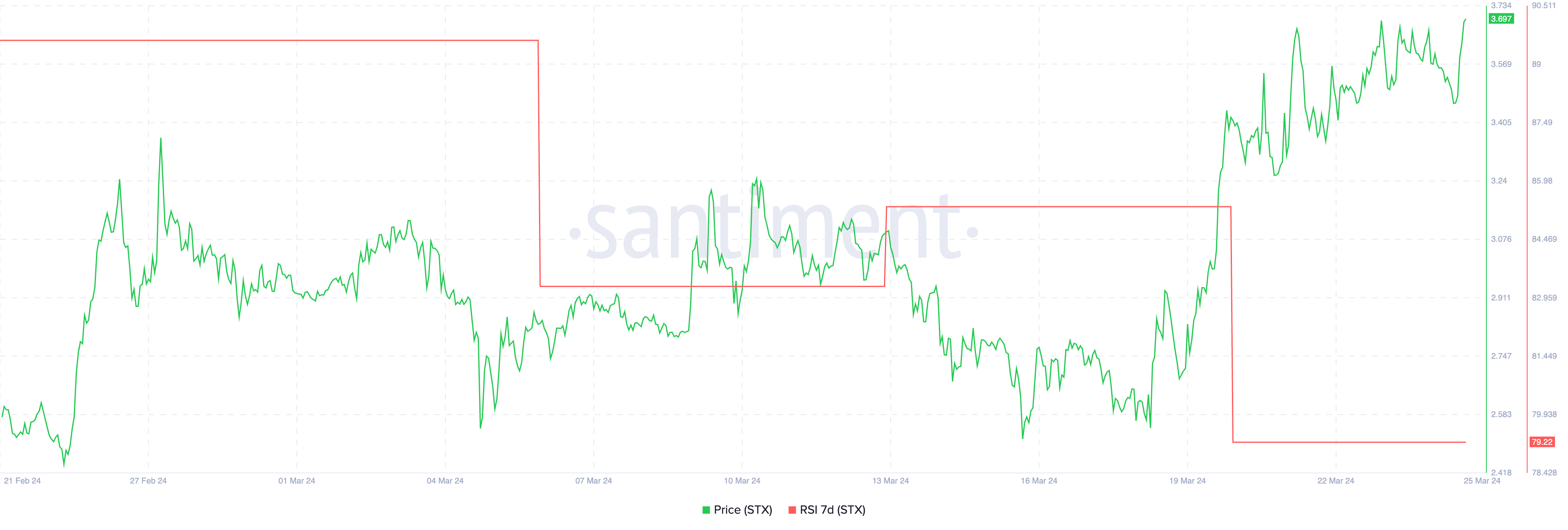 スタックス(STX)の7日相対力指数(RSI)の最近の下落は、トレーダーを警戒させている。買い圧力と売り圧力の指標であるRSIは、先週の高値83から現在の79まで下落した。この4ポイントの下降は、モメンタムが変化する可能性を示唆している。