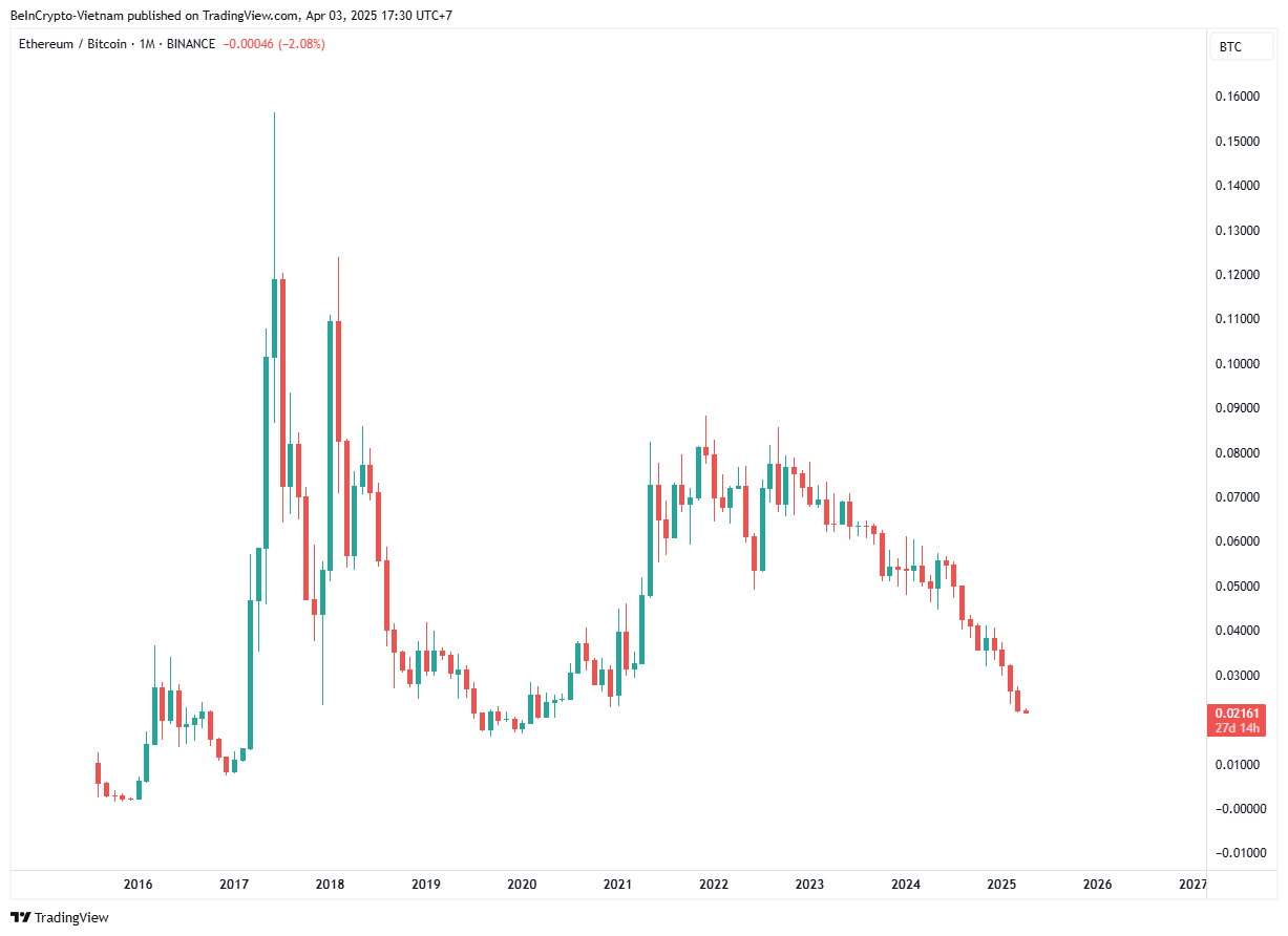 本稿執筆時点で、ETH/BTCは0.021 BTCの新たな低水準に落ち込んでいる。これは2021年以来の最低水準である。アナリストは、レイヤー2ソリューションの増加がイーサリアムのエコシステムを分断したことが、過去1年間の失望的な価格パフォーマンスに寄与していると指摘している。