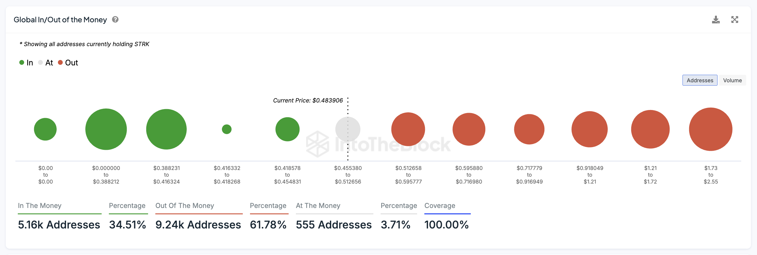 Starknet(STRK)には0.51ドルと0.59ドルの強いレジスタンスレベルがあり、かなりの数のアドレスがより高い価格でトークンを保有しており、売り圧力につながる可能性があります。