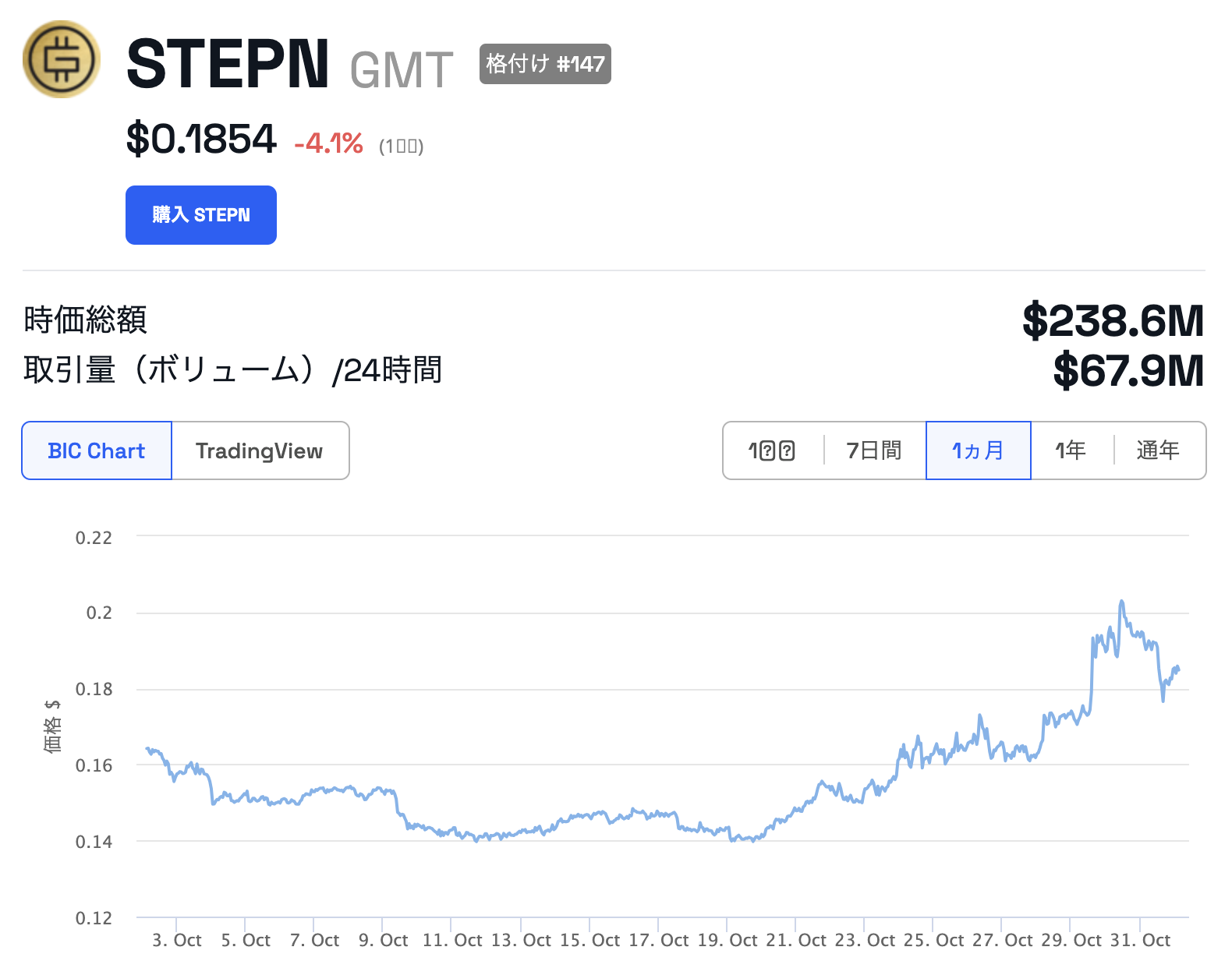 暗号通貨GMTは現在、前日比4.1%減の0.1854ドル。