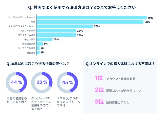 - 3 カ国の市場全体でよく使用されている決済方法は「クレジット/デビットカード (70%) 」で、「現金」派は 68%、中でも日本市場単体では未だに「現金」が1位 (73%) に。今後10年以内に「クレジット/デビットカード」使用が減少すると 52% の人が予想