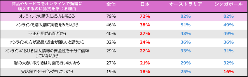 3カ国平均として79%が「オンラインで商品やサービスを購入する際に抵抗を感じることがある」と回答しており、抵抗を感じる理由としては、「オンラインで購入前に実物を見たいから (46%) 」、「 不正利用が心配だから (40%) 」、「返品/返金対応が難しいから (32%) 」、「個人情報の安全性が信頼できないから (29%) 」という結果となりました。