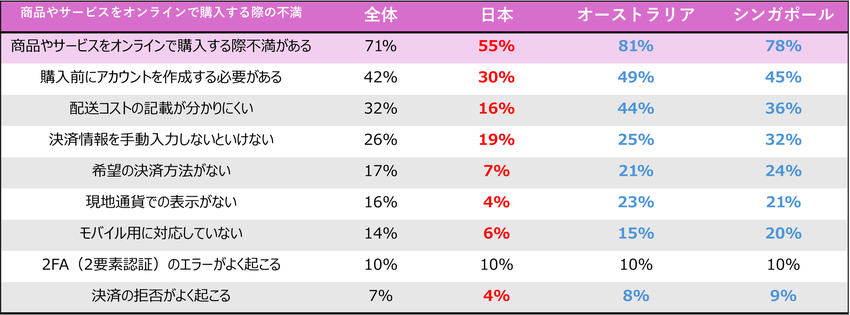- デジタル決済では、3ヵ国平均で 71% の人がオンラインでの購入体験に不満を持っている一方、日本は 55%とオンライン購入による不満度が比較的低いことが判明