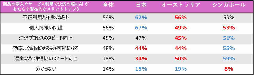 また、3カ国全体の59%が、商品の購入やサービス利用で決済の際に AIがもたらす潜在的なメリットとして、「AIによる詐欺や不正利用の防止」を挙げており、他にも「個人情報の保護 (56%)」、同率の48%で「質問の解決」や「決済プロセスのスピード向上 」などがあった。単なるECでの購入や決済体験の向上だけでなく、増加傾向にある不正利用や詐欺に対しての解決方法として、AIを期待している人が多いことが明らかになった。