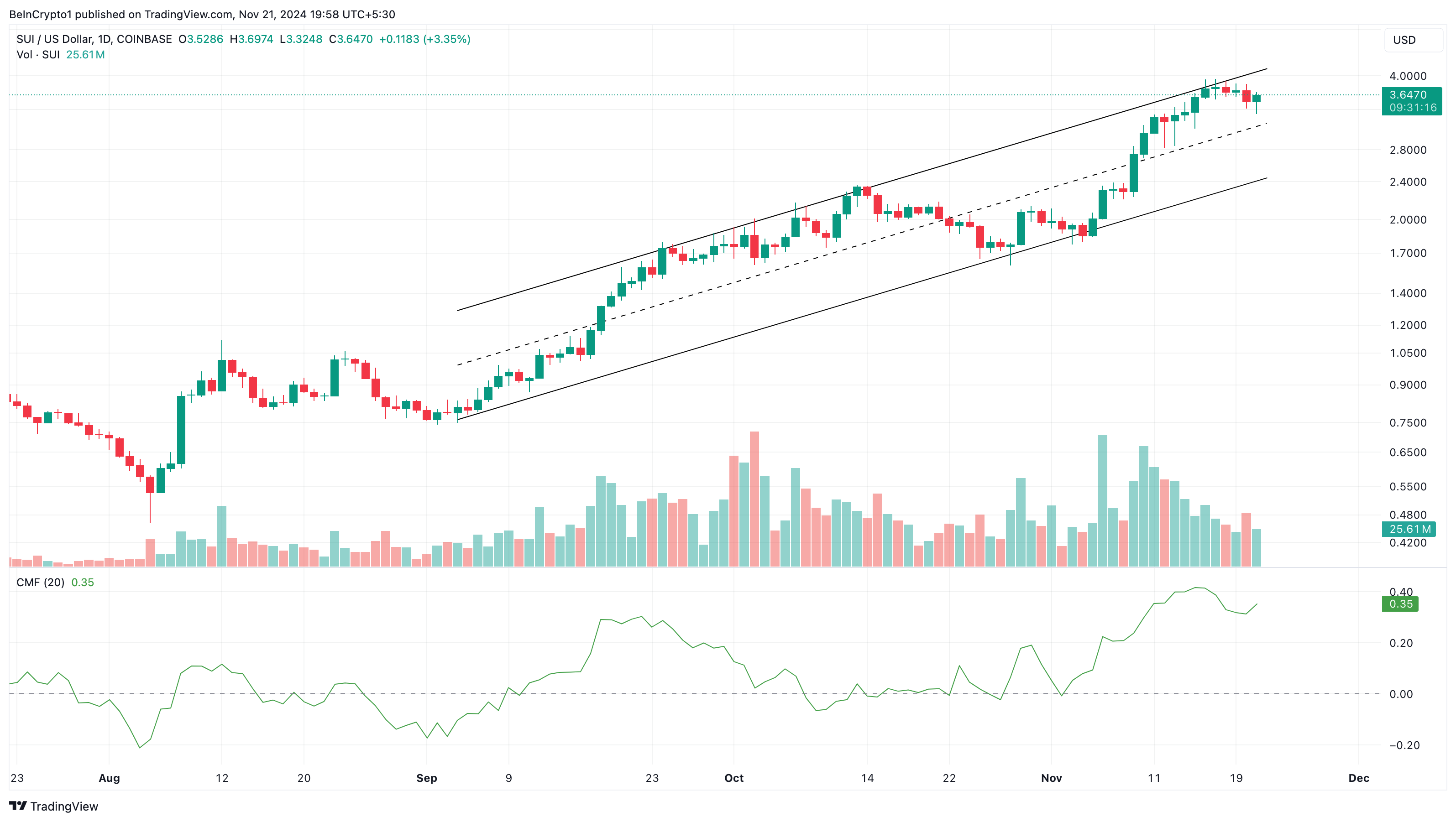 日足チャートでは、SUIは上昇チャネル内で取引を続けている。上昇チャネルは、2本の平行な上向きの線で定義されるチャートパターンである。