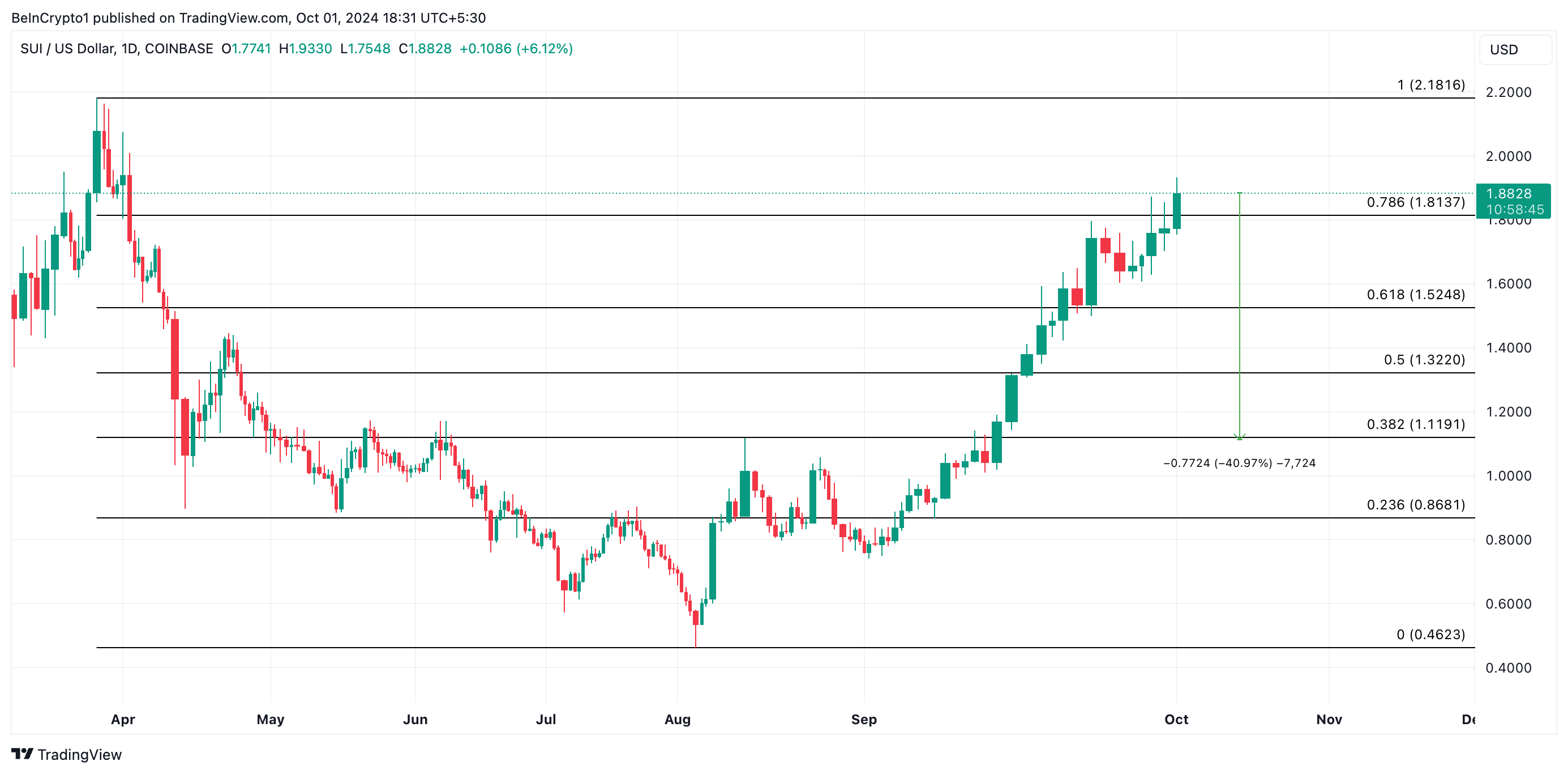 この買いの勢いが続けば、SUIは史上最高値の2.18ドルを取り戻す可能性があります。フィボナッチ・リトレースメントの測定値は、SUIがその価格に向かう途中で主要なレジスタンスレベルを突破したため、この目標が達成可能であることを示唆しています。