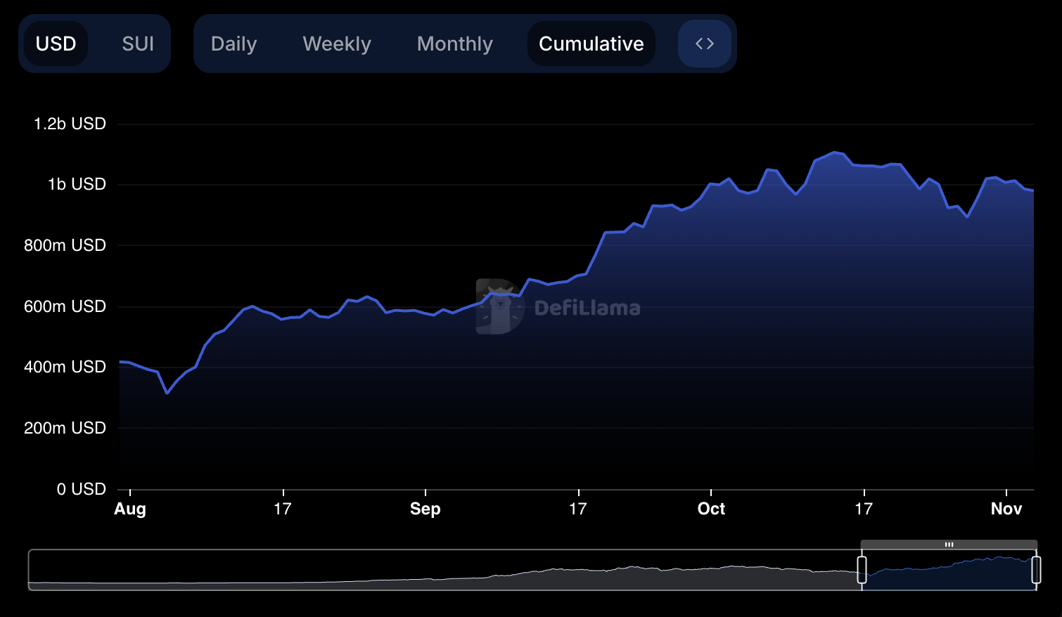 SUIの時価総額(TVL)は現在9億7900万ドルで、8月4日の3億1300万ドルから印象的に急増した。9月30日には、SUIのTVLが初めて10億ドルを超え、顕著な価格上昇と一致した。