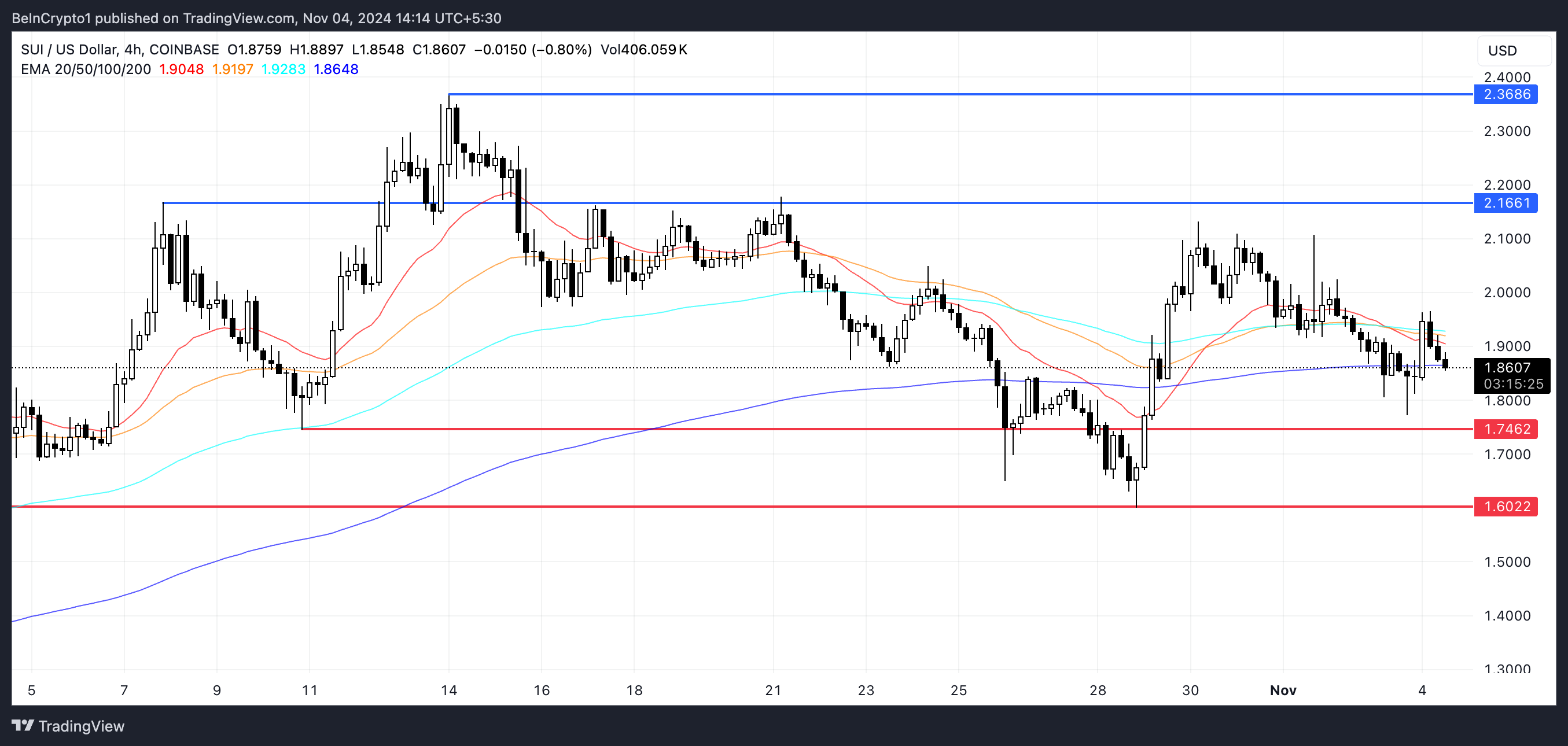 一方、ADXは現在の下降トレンドに強い勢いがないことを示しており、反転の余地がある。上昇トレンドが形成されると、SUIは2.16ドルの抵抗をテストする可能性がある。このレベルを突破すると、さらなる利益が得られ、価格は2.36ドルに達する可能性があり、26.8%の増加が見込まれる。