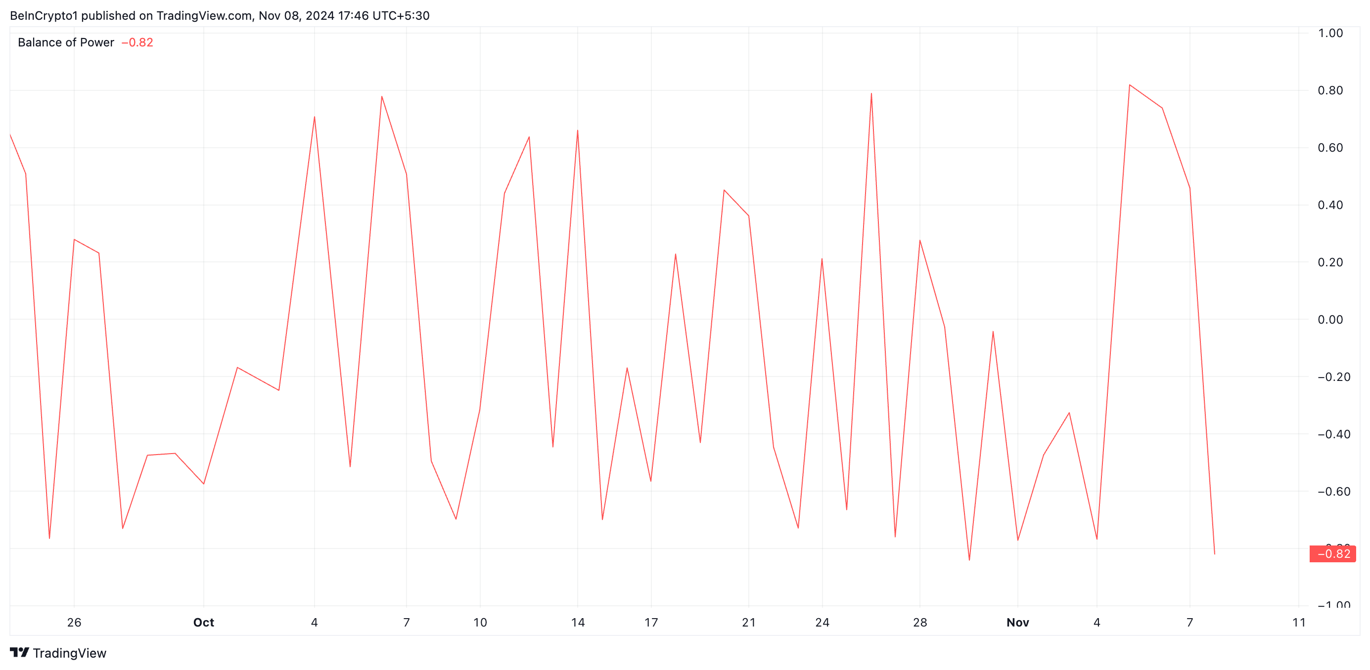 この指標は市場における買い手と売り手の強さを測る。ネガティブなBoPは売り手が支配しており、資産の価格を下げようとしていることを示唆している。