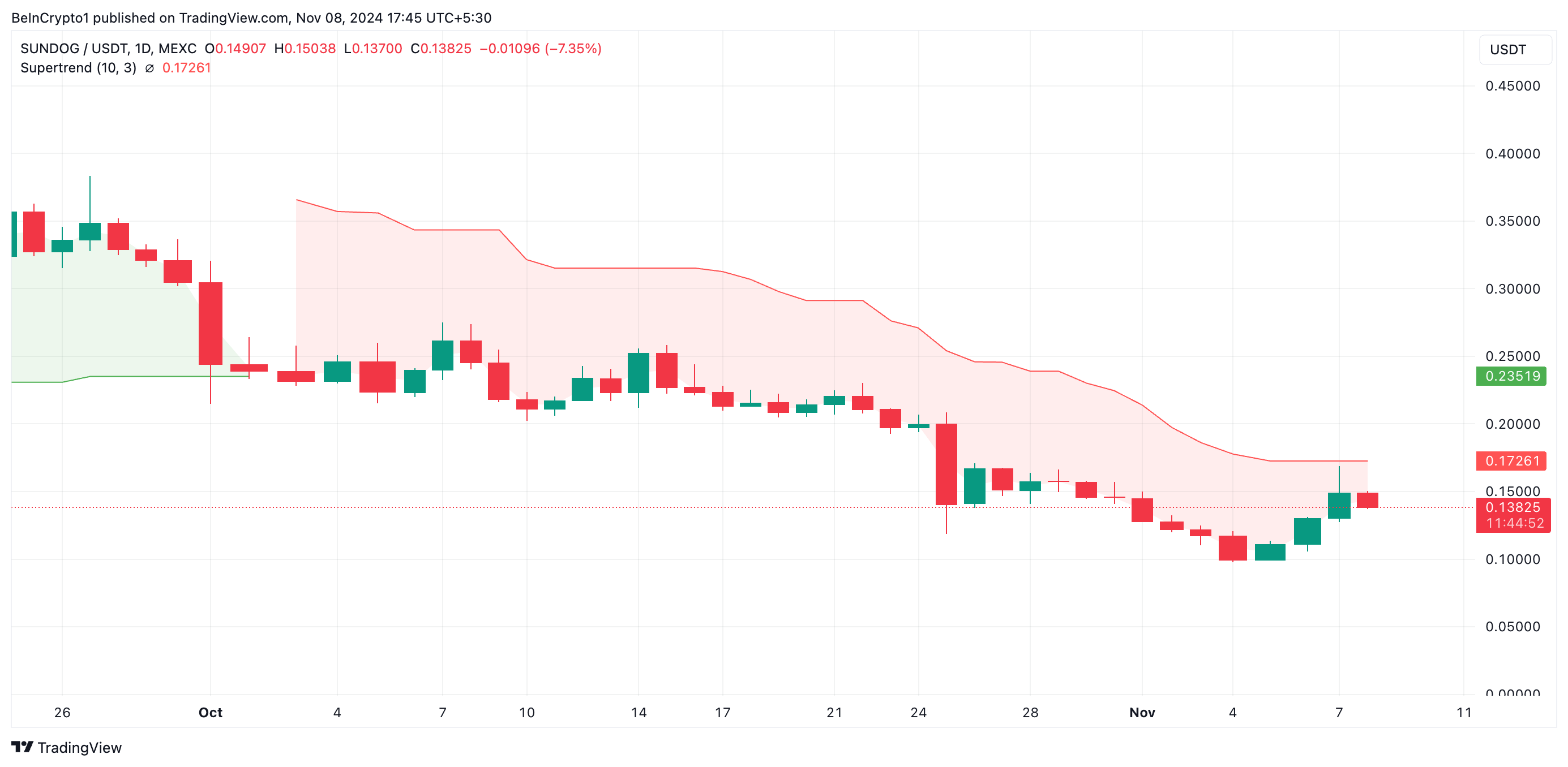 現在、SUNDOGのスーパートレンドラインの設定は、この潜在的なブルトラップの重要な指標である。報道時点で、指標の赤いラインはSUNDOGの価格の上にある。