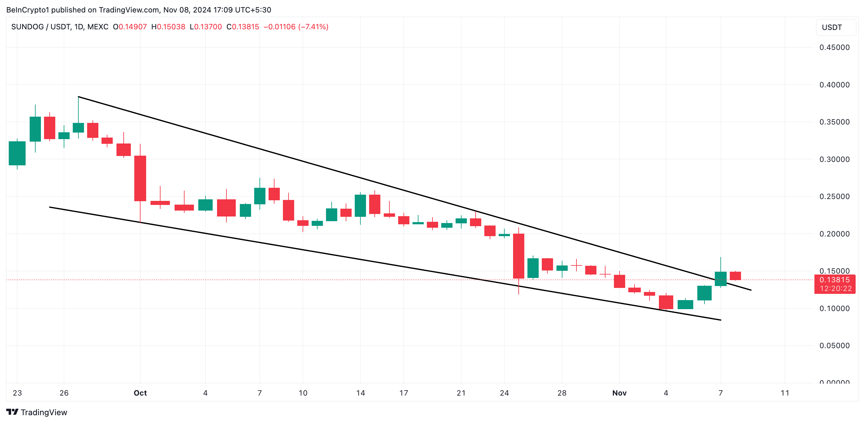 トロンベースのミームコイン、サンドッグ(SUNDOG)は過去24時間で8%上昇し、9月以来取引されていた下降ウェッジパターンを突破した。