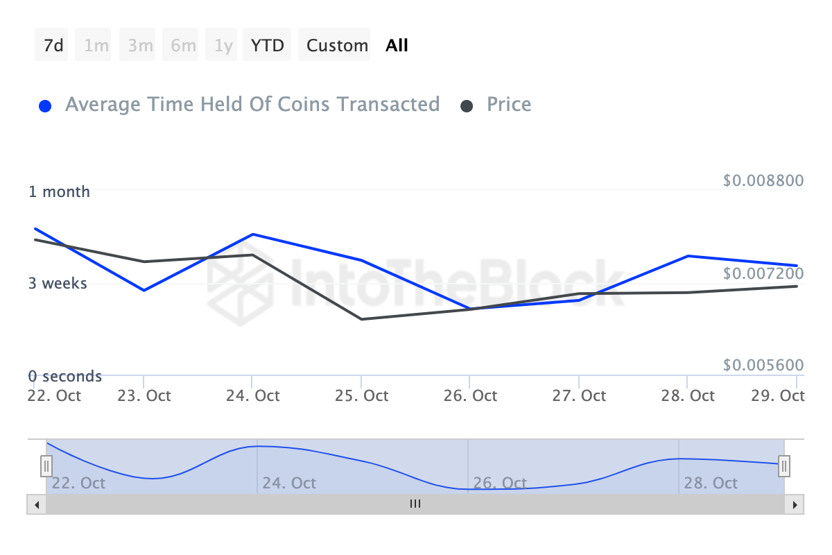 Notcoinの価格が下がった1つの理由は、売り圧力の顕著な増加でした。しかし、IntoTheBlockによると、特にコイン保有時間の指標から、それはもはや問題ではありません。