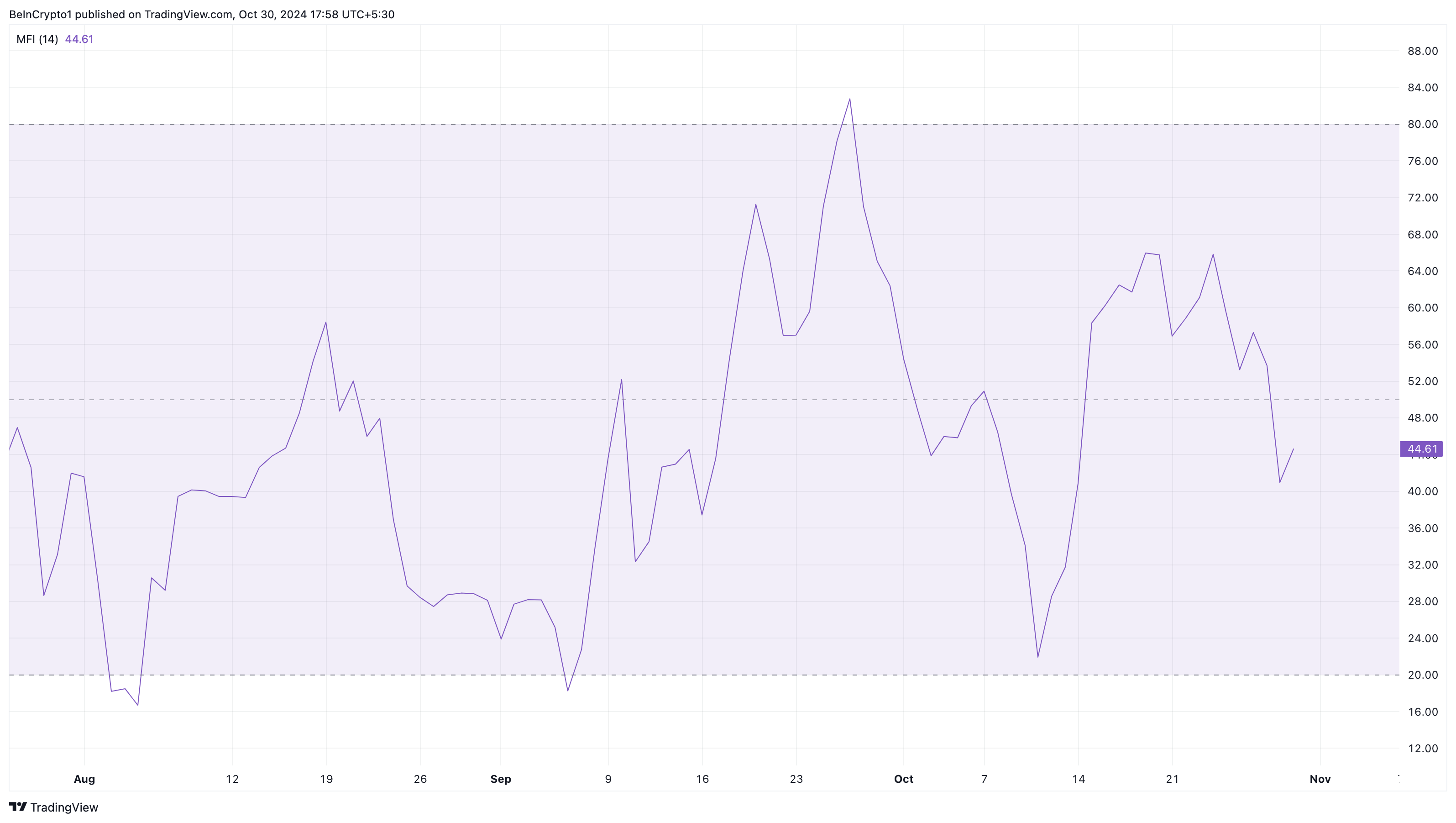 反発の可能性を示すもう一つの兆候は、マネーフローインデックス(MFI)です。これは、価格とボリュームデータを組み合わせた技術的オシレーターで、購入と売却の圧力を測定します。