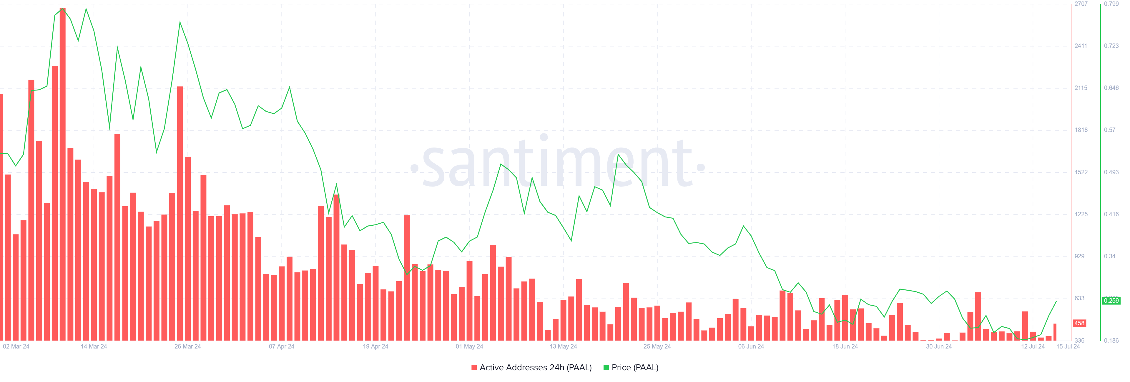 PAALの価格はここ1日で2桁の上昇率となっている。価格が回復し始めると、PAAL AIのアクティブ・アドレスは減少を続け、これは値動きにとって強気のサインではない。