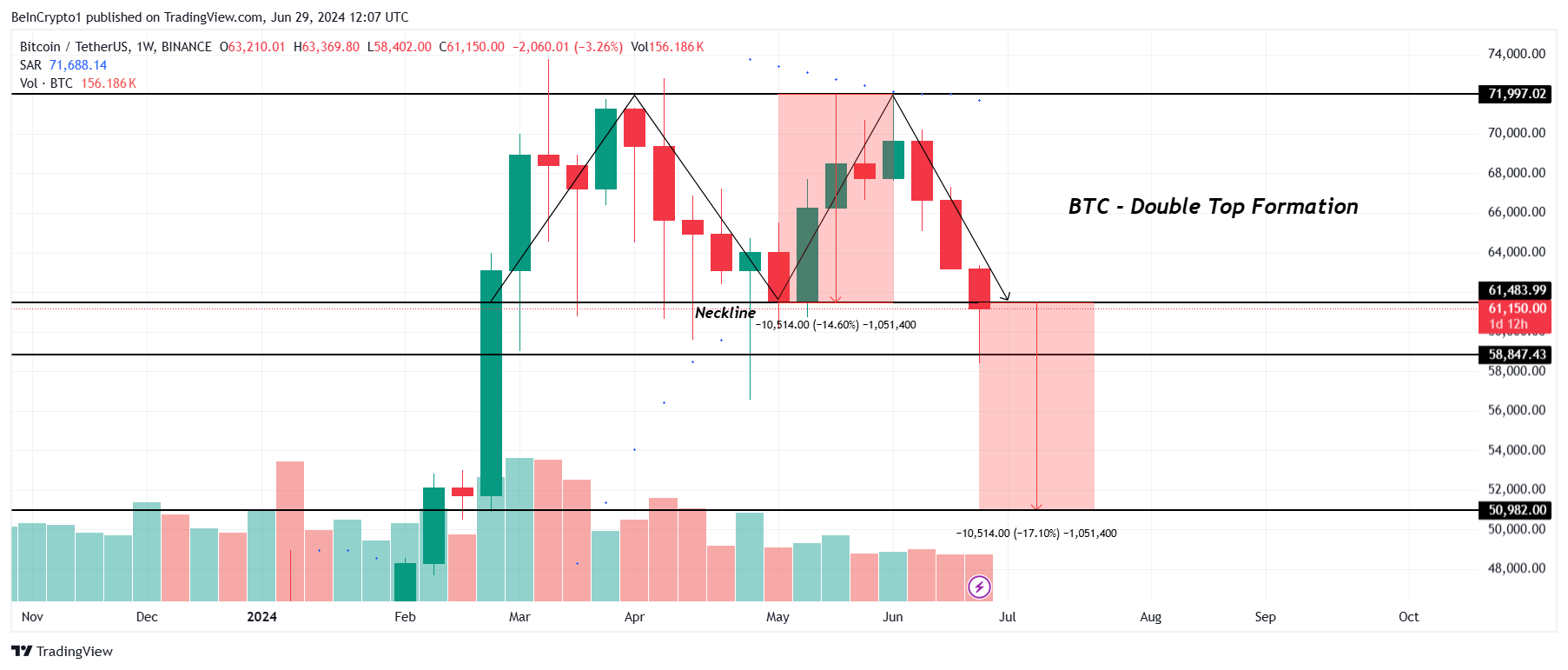 週足チャートのBTCはダブルトップ・パターンを形成している。このマクロ的な弱気パターンは、資産が下降トレンドに入る可能性があることを示唆している。ビットコインの価格は、61,483ドルのネックラインを下方にブレイクしている。