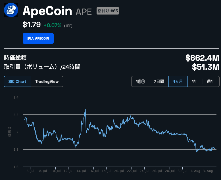 国内暗号資産取引所で取引が可能なBAYC(Bored Ape Yacht Club)の分散型コミュニティをサポートやカルチャーやゲーム、商取引で利用されるNFT関連仮想通貨APEコインは1日、252.39円を付け最低価格を更新。NFTコレクションBAYC(Bored Ape Yacht Club)は7月3日、最低取引価格(フロア価格)27.03ETHに下落。2021年10月以来の安値を更新していた。