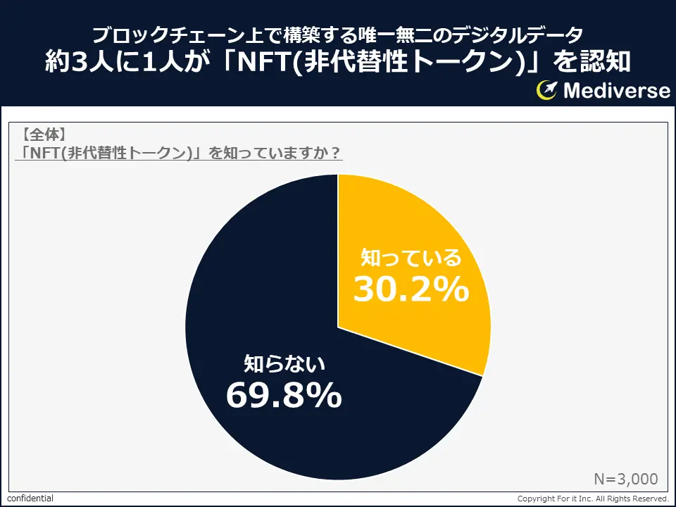 Web3メディアMediverseを運営するフォーイットがこのほど公開した3,000人の20~59歳の男女を対象に行った調査によれば、日本にNFTの認知度は約3人に1人という結果だった。