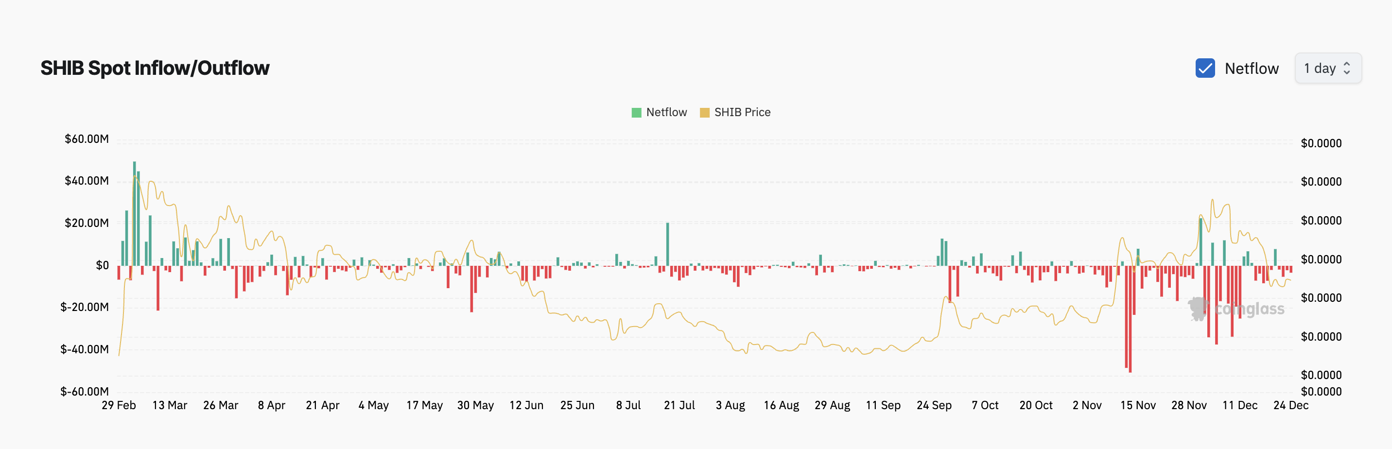 SHIBの現物市場からの純流出が観察されており、投資家が保有を売却する傾向が強まっていることを示している。今日だけで320万ドルがミームコインの現物市場から流出し、保有者がコインを売却している。これはSHIB現物市場からの流出が4日連続で続いており、合計で1300万ドルが引き出されている。