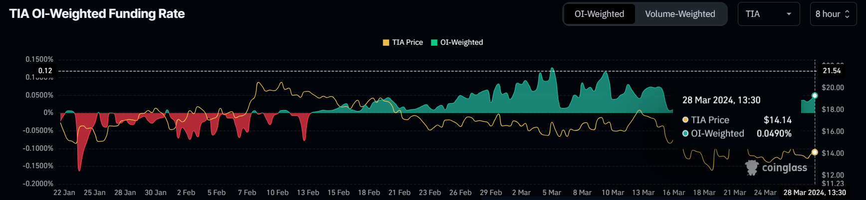 Celestiaの価格は、本稿執筆時点では13.8ドルで取引されており、13ドルからかろうじて回復している。しかし、これは、TIA投資家がアルトコインに強気の賭けを続けているため、楽観的な見方を鈍らせていない。