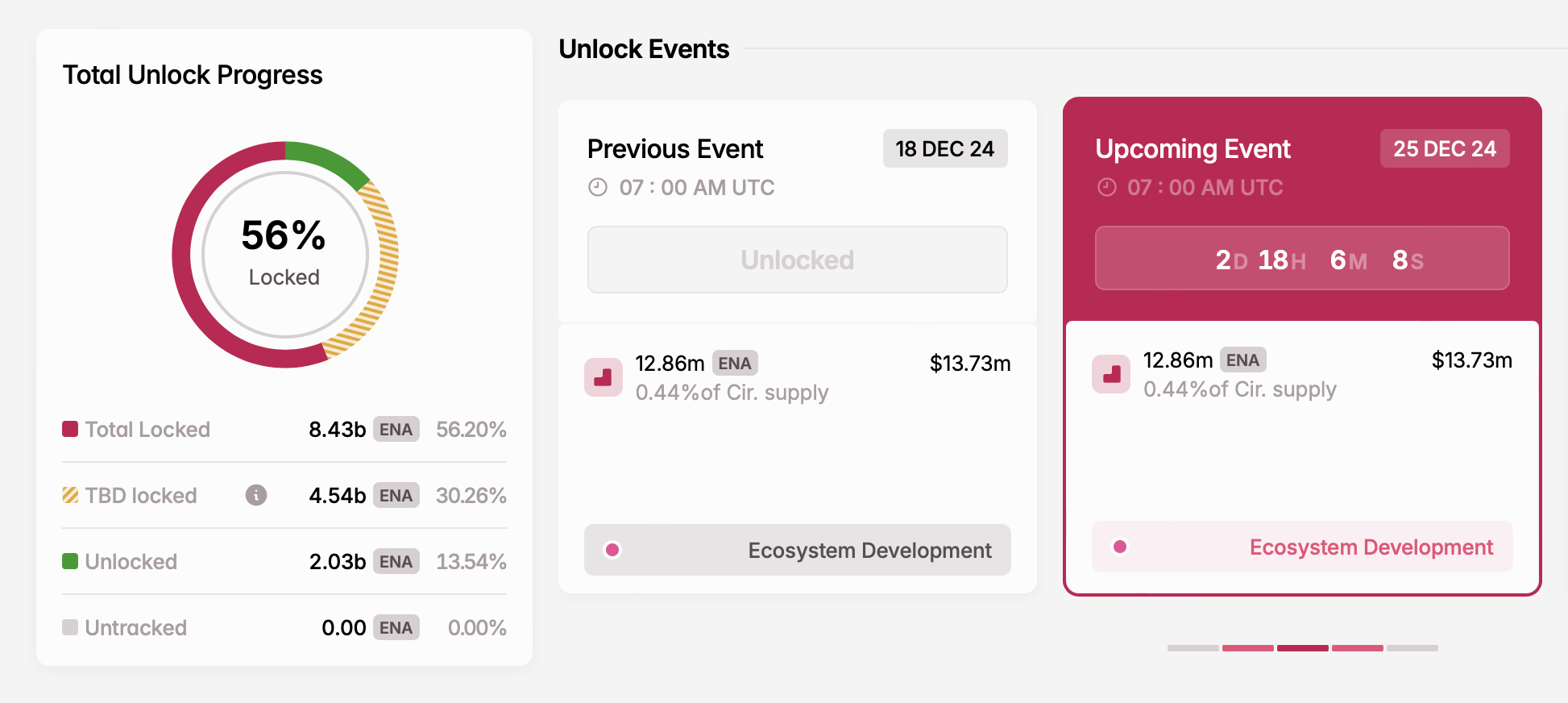 プロトコルのネイティブトークンENAは、保有者がガバナンス決定に参加することを可能にする。12月25日に、Ethenaは1,200万以上のENAを解放し、その価値は1,373万ドルであり、エコシステム開発に向けて割り当てられる。