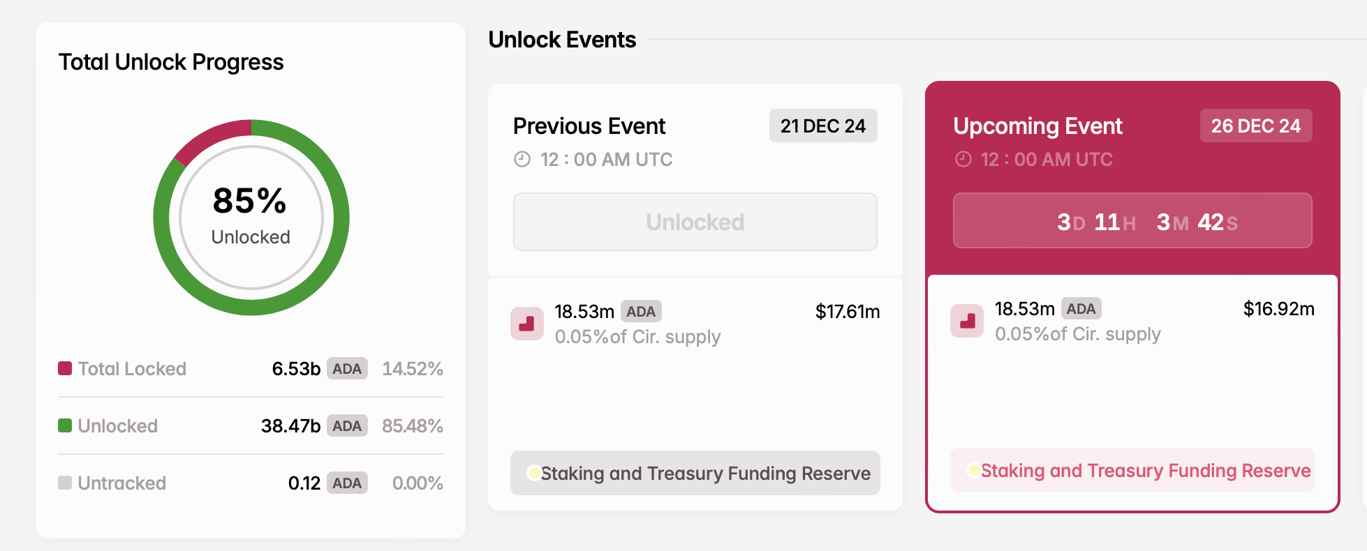 - ロック解除されるトークン数: 1,853万ADA