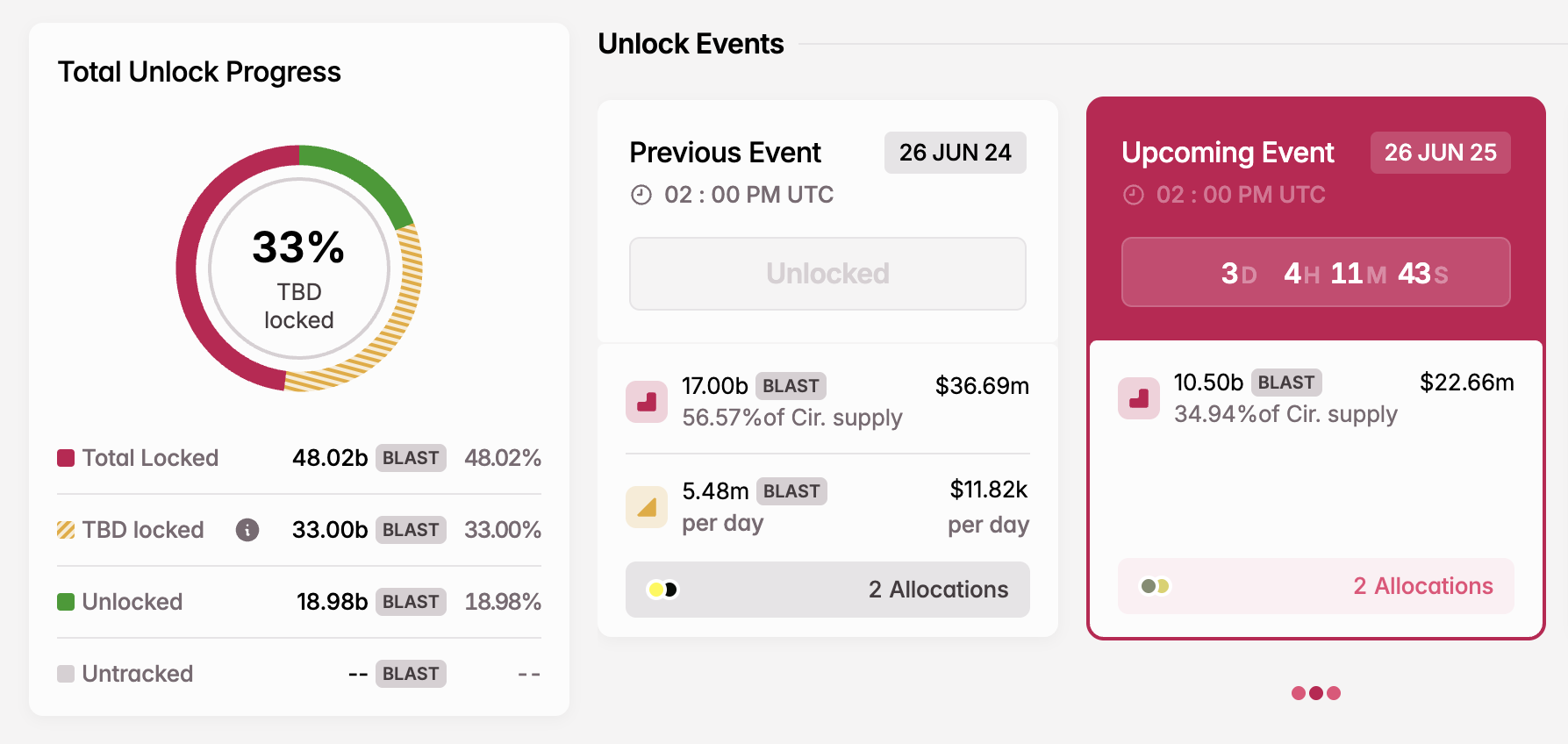 6月26日には、ネットワークが105億トークンを解放し、その価値は22.6百万ドルに達する。この大規模なリリースは、BLASTの現在の流通供給量の34.94%を占める。