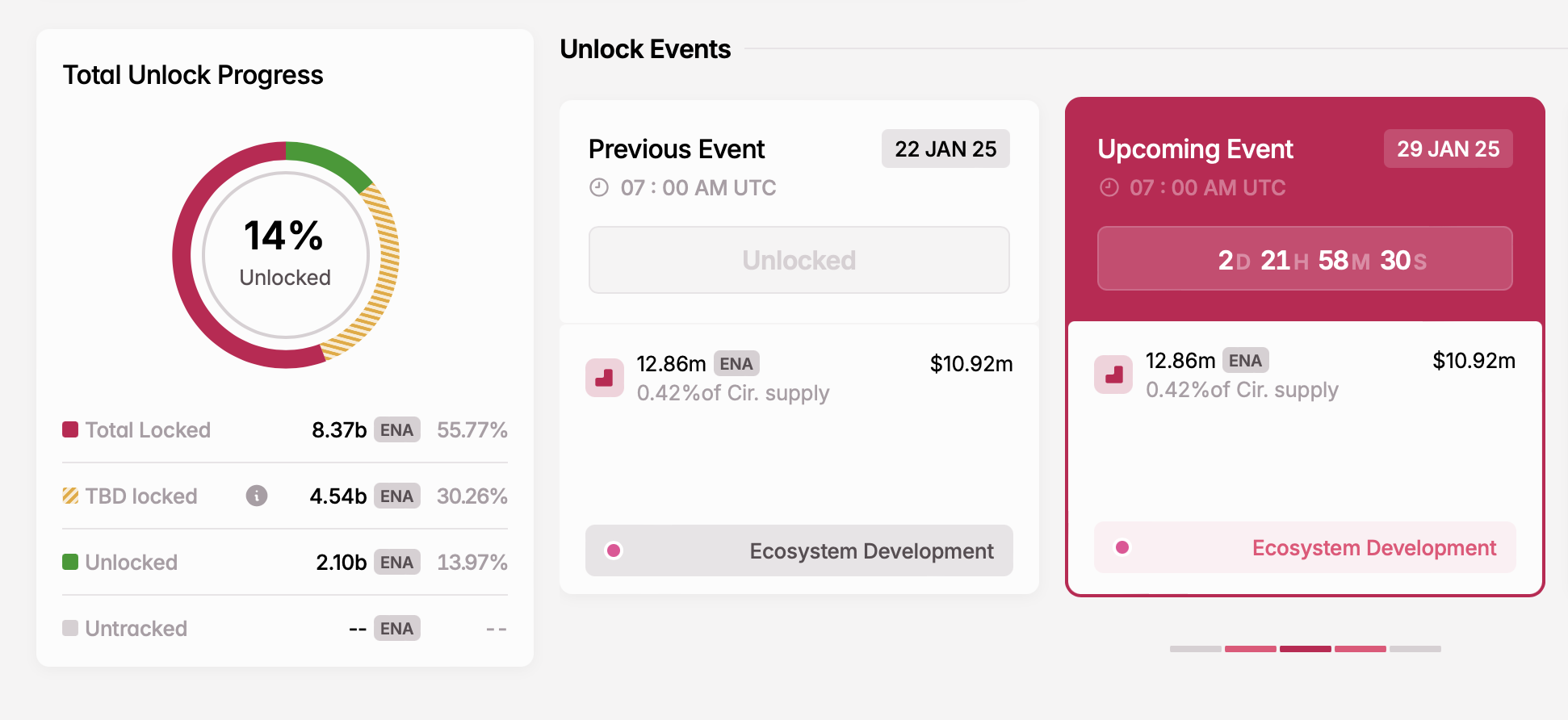 EthenaのネイティブトークンENAは、プロトコルのガバナンス決定に参加するために保有者に利用される。1月29日に、Ethenaは1200万以上のENAトークンをロック解除し、1100万ドルの価値がある資金をエコシステム開発に割り当てる。