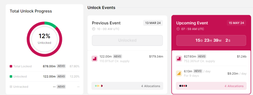 それに遠く及ばず、Aevoは5月15日に8億2760万AEVOトークン(時価総額12億4000万ドル)のリリースを準備している。詳細は以下の通り: