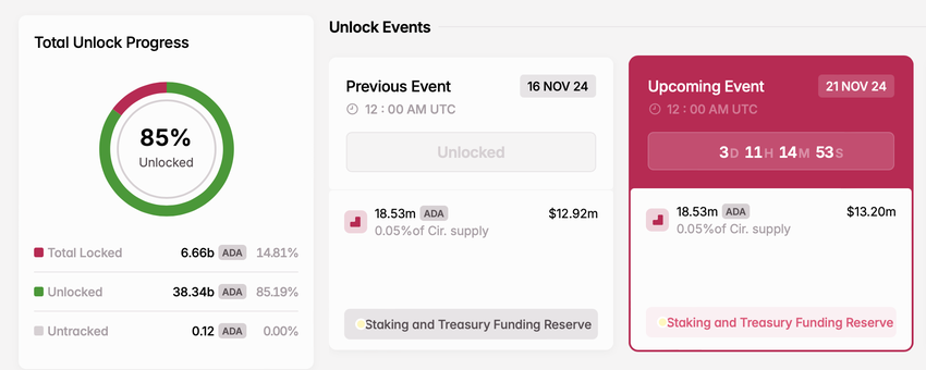 Cardanoは、持続可能性、セキュリティ、スケーラビリティへの取り組みで知られており、分散型アプリケーションやスマートコントラクトの進展に重要な役割を果たしている。ネットワークは21日、1800万以上のADAトークンを解除する計画で、割り当てはステーキングと財務基金の予備資金に向けられる。