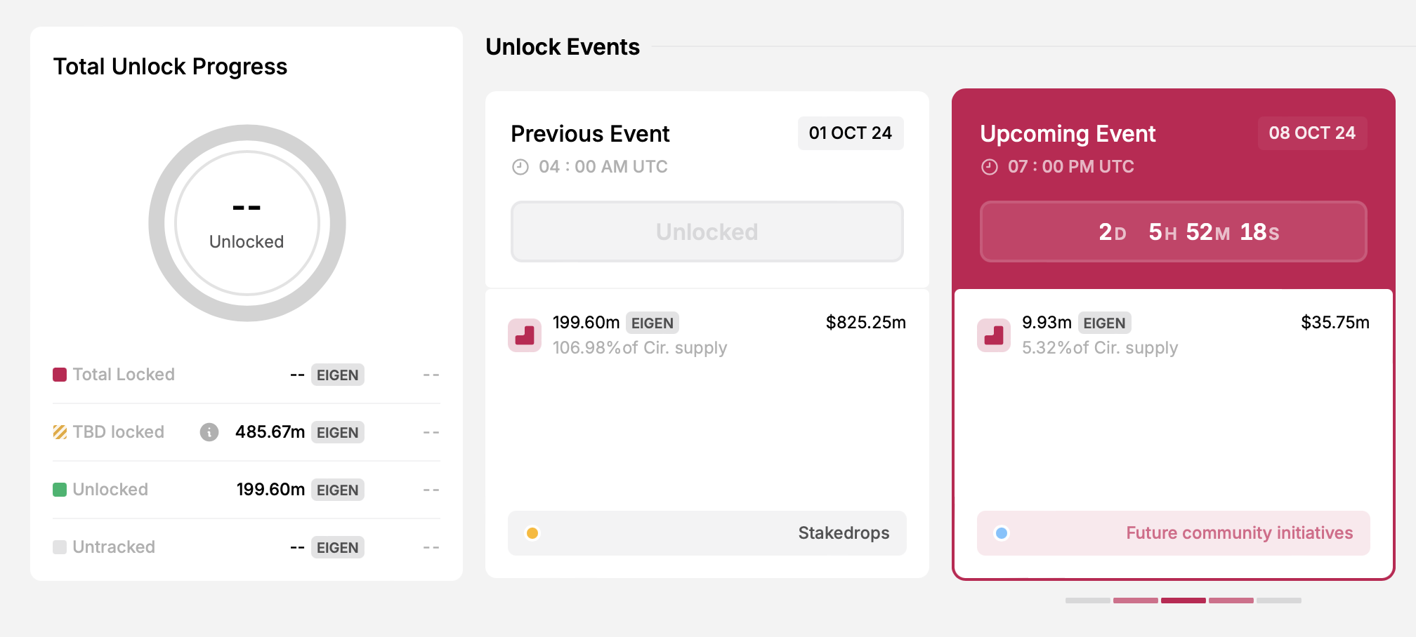 Ethereumベースの再ステーキングプロトコルであるEigenLayerは、10月に入り主要な取引所にEIGENトークンを上場しました。10月8日には、プロジェクトはほぼ1000万EIGENを解除し、現在の価値は3575万ドルです。これらのトークンは将来のコミュニティイニシアティブのために割り当てられるため、解除がトークン価格に影響を与えることはありません。