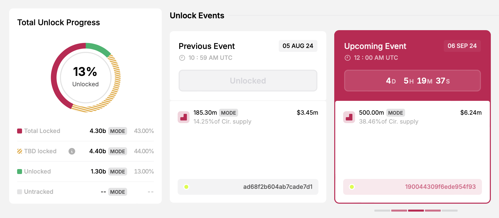 「来週は、2%以上で4つのアンロックがありますが、特に注目すべきは、9月5日に供給量の19%、9月6日に$MODE回の38.46%をアンロックする$TAIKOです。スーパートークノミクス」と、あるXユーザーはコメントしました。