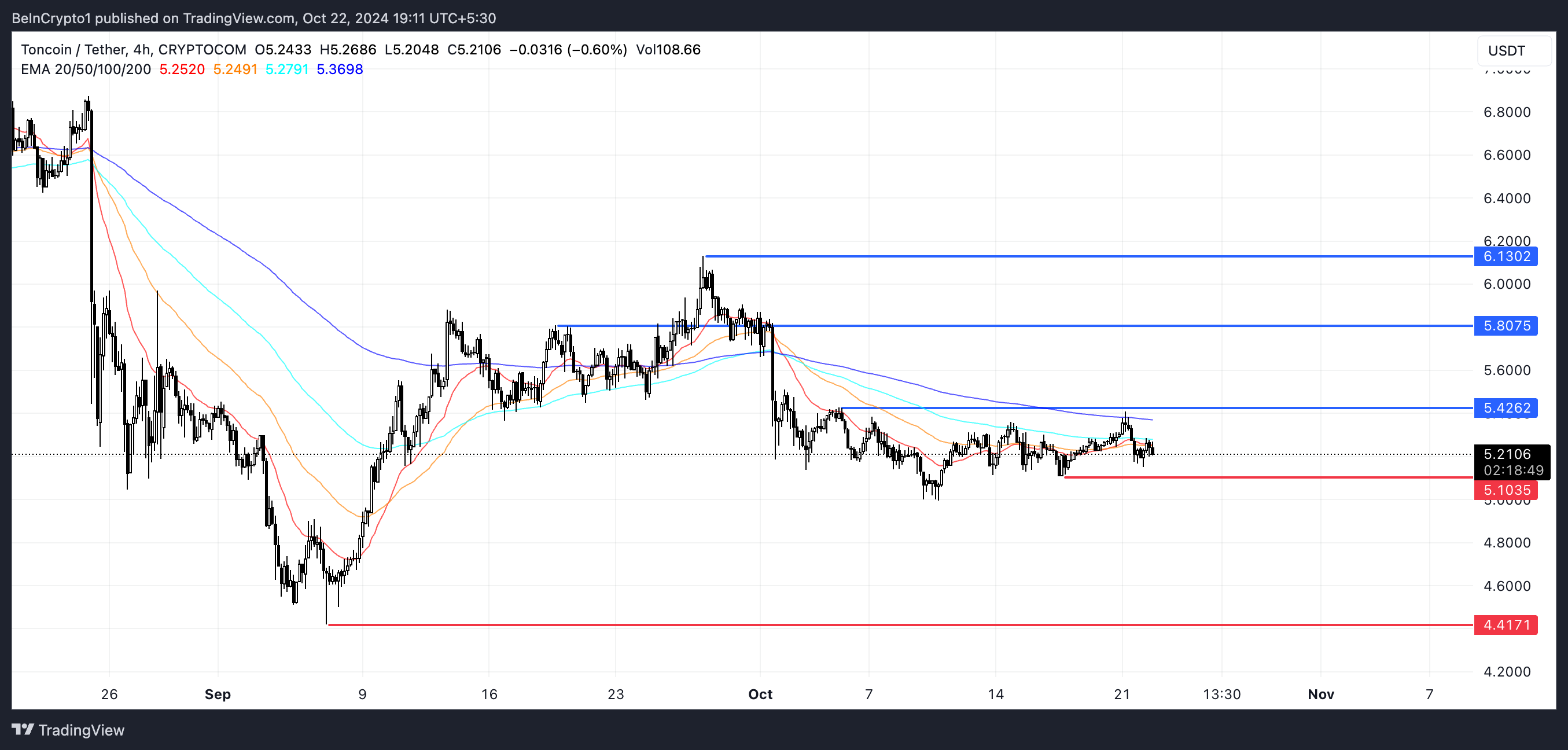 さらに、移動平均線は下向きのトレンドを示しており、価格はこれらの線の下に留まっています。これは現在の弱気のセンチメントをさらに確認しています。雲が上方の抵抗を提供し、価格が一貫して$5.2レベルの周辺で推移しているため、TONは統合フェーズにあると見られます。